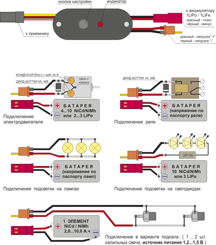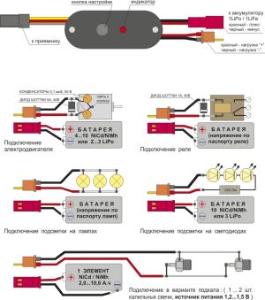 Подключение устройства следует производить в соответствии с рисунком, строго соблюдая цветовую маркировку проводов (красный - плюс, черный - минус). Трехцветный провод с фишкой подключается к соответствующему каналу приемника. Кнопка настройки и светодиодный индикатор вмонтированы непосредственно в корпус устройства.