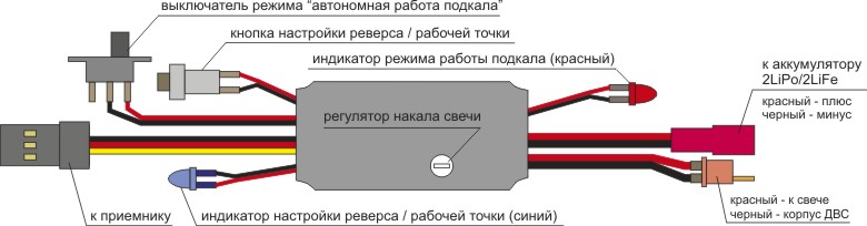 Установку устройства следует производить в строгом соответствии с пояснениями, приведенными на рисунке. Подкал следует закрепить в корпусе модели между приемником и ДВС. Трехцветный провод с фишкой подключается к соответствующему каналу приемника, предварительно установленного на борту модели (непосредственно либо через Y-кабель). “Кнопку настройки реверса / рабочей точки” следует установить в доступном месте. Если требуется регулярная настройка рабочей точки, то кнопку следует вынести наружу из корпуса модели. “Индикатор настройки реверса / рабочей точки” и “индикатор режима работы подкала” следует разместить в месте модели, удобном для обзора. Индикаторы представляют собой ультраяркие светодиоды и позволяют оценивать работу подкала и состояние силового аккумулятора при удалении модели. “Выключатель режима “автономная работа подкала” также следует установить в легкодоступном месте. Это позволит включать-выключать подкал на время запуска двигателя модели независимо от положения ручки пульта управления. В выключенном состоянии данного переключателя включение и выключение подкала осуществляется по команде с пульта. Силовые провода следует подключить к свече двигателя и силовому аккумулятору в соответствии с рисунком. При подключении силовых проводов необходимо строго придерживаться цветовой маркировки (красный - плюс, черный - минус). Силовой аккумулятор устанавливается и подключается в самую последнюю очередь.