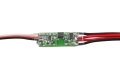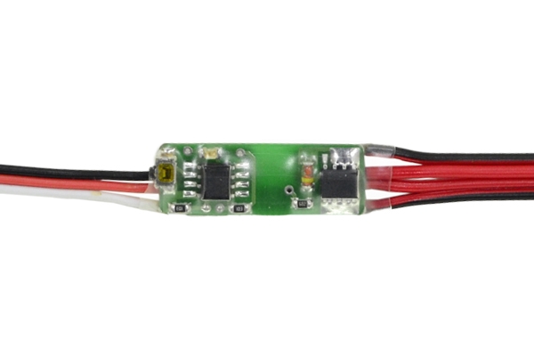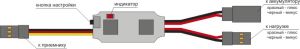 Подключение устройства следует производить в соответствии с рисунком и строго соблюдая цветовую маркировку проводов (красный - плюс, черный - минус). Трехцветный провод с фишкой подключается к соответствующему каналу приемника. Кнопка настройки и светодиодный индикатор установлены непосредственно на плате устройства. Проверку работоспособности и настройку устройства следует производить до подключения внешнего силового аккумулятора и нагрузки. Такая возможность обеспечивается благодаря тому, что вся сигнальная часть схемы питается непосредственно от приемника.