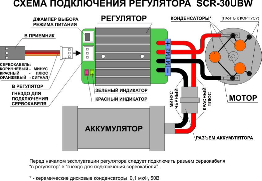 После запусков модели регулятор следует обязательно отключить от аккумулятора. Не допускается попадание в регулятор пыли и воды.