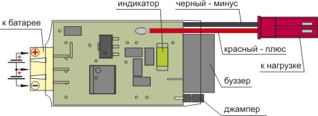 Îòñå÷êà ïîäêëþ÷àåòñÿ íåïîñðåäñòâåííî ê áàëàíñèðíîìó ðàçúåìó àêêóìóëÿòîðíîé áàòàðåè (îí ñîîòâåòñòâóåò ñòàíäàðòó áîëüøèíñòâà áàòàðåé). Âûõîäíîé ðàçúåì îòñå÷êè - ñòàíäàðòíûé ñèëîâîé äëÿ ìàëîìîùíûõ àêêóìóëÿòîðîâ. Ïðè ýòîì îòñå÷êà ñàìîòåñòèðóåòñÿ îäíîêðàòíûì ìèãàíèåì ñâåòîäèîäà è ñðàáàòûâàíèåì áóççåðà, ïîñëå ÷åãî ñâåòîäèîä äîëæåí ñâåòèòüñÿ ïîñòîÿííî. Çàòåì ìîæíî ïîäêëþ÷àòü íàãðóçêó.