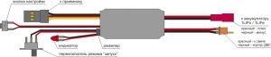 Трехцветный провод с фишкой подключается к соответствующему каналу приемника, предварительно установленного на борту модели (непосредственно либо через Y-кабель). Силовые провода следует подключить к свече ДВС и силовому аккумулятору в соответствии с рисунком. При подключении силовых проводов необходимо строго придерживаться цветовой маркировки (красный - плюс, черный - минус). Силовой аккумулятор устанавливается в самую последнюю очередь и подключается к подкалу непосредственно перед запуском модели.