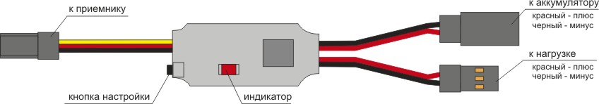 Подключение устройства следует производить в соответствии с рисунком и строго соблюдая цветовую маркировку проводов (красный - плюс, черный - минус). Трехцветный провод с фишкой подключается к соответствующему каналу приемника. Кнопка настройки и светодиодный индикатор установлены непосредственно на плате устройства.