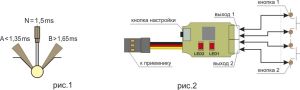 Программирование. Начальная установка нейтрали N - 1,5 мс. Программирование производится настроечной кнопкой и контролируется при помощи светодиодных индикаторов LED1 и LED2. Для изменения положения нейтрали следует при включенных пульте управления, приемнике и блоке установить желаемое положение ручки на пульте, затем нажать и удерживать кнопку программирования. После того, как индикаторы начнут мигать, новое положение нейтрали N запрограммировано. После этого кнопку настройки следует отпустить. Положения точек переключения секторов А и В отстоят от нейтрали примерно на 0,15 мс в меньшую и большую сторону соответственно и смещаются одновременно с настройкой точки нейтрали N.
