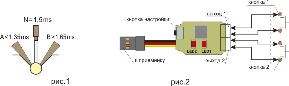 Питание схемы мультисвича осуществляется непосредственно от шины питания приемника. Первичные настройки точек показаны на рис. 1. В дальнейшем положение нейтрали N может быть перепрограммировано. В нейтрали N выходы каналов 1 и 2 разомкнуты. При переводе ручки пульта управления в сектор В замыкается выход канала 1 и загорается LED1, выход канала 2 при этом разомкнут. При переводе ручки пульта в сектор А замыкается выход канала 2 и загорается LED2, выход канала 1 разомкнут. Смещение настроечных точек N, A и В осуществляется при помощи кнопки программирования.