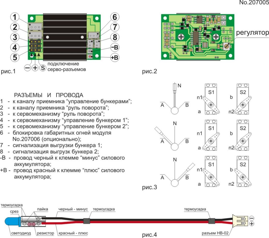 Кроме непосредственного управления сервомеханизмами бункеров, модуль обеспечивает световую сигнализацию процесса выгрузки миганием светодиодов. Каждому бункеру соответствует свой светодиод. Модуль также позволяет на время выгрузки бункера блокировать свечение задних габаритных огней кораблика со стороны выгрузки (опционально). Для реализации данной функции на кораблике должен быть установлен световой модуль No.207006 нашего производства, соединение с которым осуществляется кабелем No.207150.