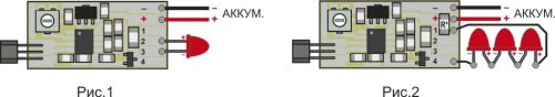 Îñíîâíàÿ ñõåìà âêëþ÷åíèÿ ñ îäíèì êðàñíûì ñâåòîäèîäîì ïîêàçàíà íà ðèñ.1. Äëÿ óâåëè÷åíèÿ ÿðêîñòè ìîæíî ïðèìåíèòü öåïî÷êó èç 2-3 ñâåòîäèîäîâ è äîïîëíèòåëüíîãî ðåçèñòîðà R* (ðèñ.2). Äëÿ 3 ñâåòîäèîäîâ è ïèòàíèÿ 3LiPo òðåáóåòñÿ ðåçèñòîð 560 Îì (1206).