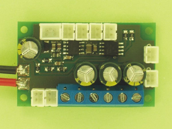 Силовые провода питания сечением #16 (1,3 кв.мм) припаиваются к площадкам “+В” и “-В”, расположенным на противоположном торце платы.