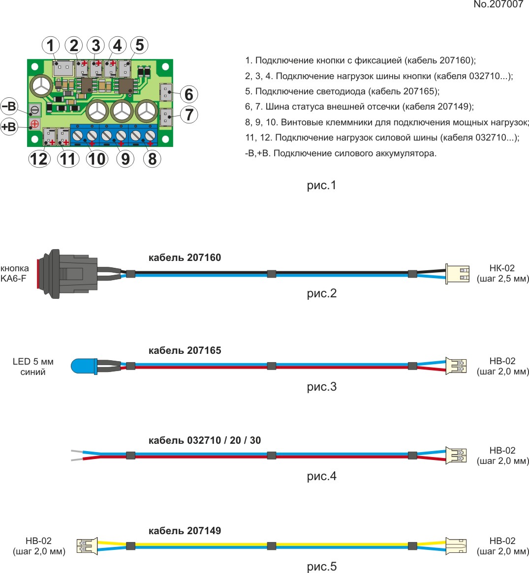 Общий вид платы модуля с обозначением всех разъемов представлен на рис.1. Управление работой модуля выключателя осуществляется при помощи вынесенной кнопки с фиксацией, подключаемой к разъему 1 (кабель 207160). Индикация режимов работы осуществляется при помощи вынесенного светодиода, подключаемого к разъему 5 (кабель 207165). Обращаем внимание, что кабеля 207160 и 207165 в комплект поставки модуля не входят и приобретаются отдельно, либо изготавливаются самостоятельно в соответствии с рис.2 и рис.3. Кнопка с фиксацией должна иметь герметичное исполнение.