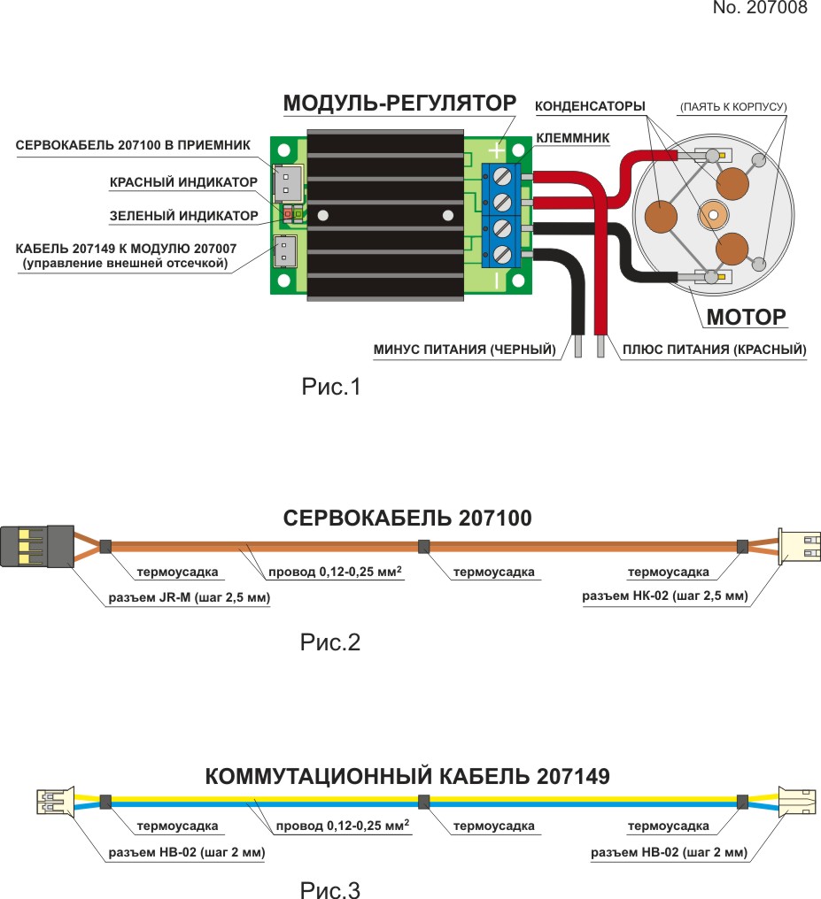 Перед подключением к приемнику и силовому выключателю следует вставить в соответствующие разъемы кабеля 207100 и 207149. Силовые провода к мотору и выключателю необходимо зачистить, концы скрутить, при необходимости - залудить, вставить в соответствующие гнезда клеммника и зафиксировать винтами. Схема подключения модуля приведена на рис.1. Кабеля 207100 и 207149 в комплект поставки модуля не входят и приобретаются отдельно, либо изготавливаются самостоятельно в соответствии с рис.2 и рис.3.