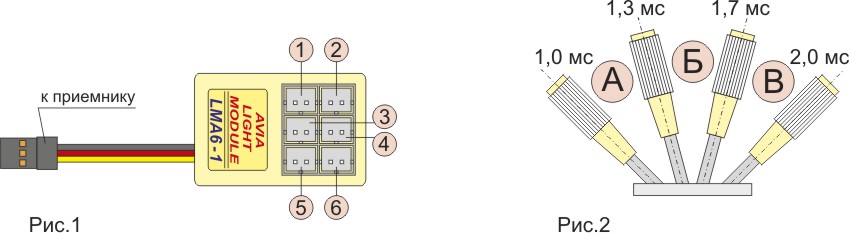 Ñâåòîâîé ìîäóëü LMA6-1 (ÁÀÍÎ) ïðåäíàçíà÷åí äëÿ óñòàíîâêè íà àâèàìîäåëè ñ ðàçìàõîì êðûëà äî 1600 ìì. Èìååò 6 âûõîäîâ äëÿ óïðàâëåíèÿ äâóìÿ êðûëüåâûìè îãíÿìè (êðàñíûé è çåëåíûé), äâóìÿ ïðîáëåñêîâûìè ìàÿêàìè (îäèíàðíûé ïðîáëåñê êðàñíûé è äâîéíîé ïðîáëåñê áåëûé) è äâóìÿ ïîñàäî÷íûìè ôàðàìè.