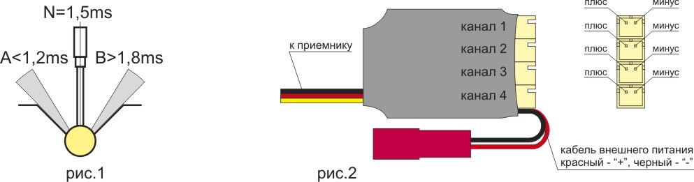 Устройство подключается в свободный канал приемника и управляется с соответствующего канала пульта управления. Имеет три рабочих сектора: "ON-OFF каналов 1 и 3", "фиксация состояния" и "ON-OFF каналов 2 и 4".
