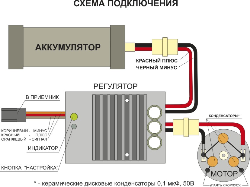 Управление регулятором осуществляется от канала “газ” аппаратуры дистанционного управления.