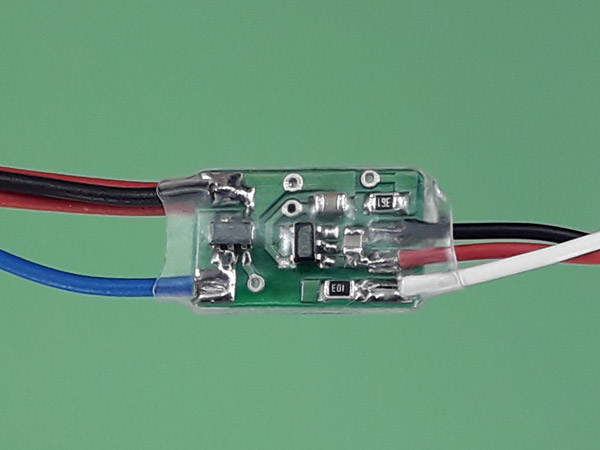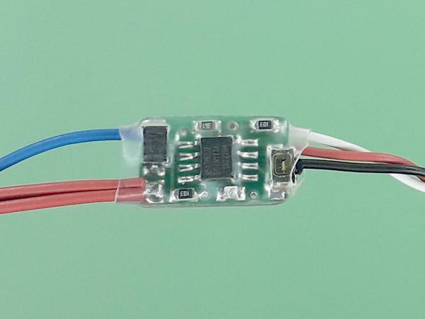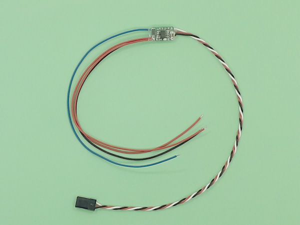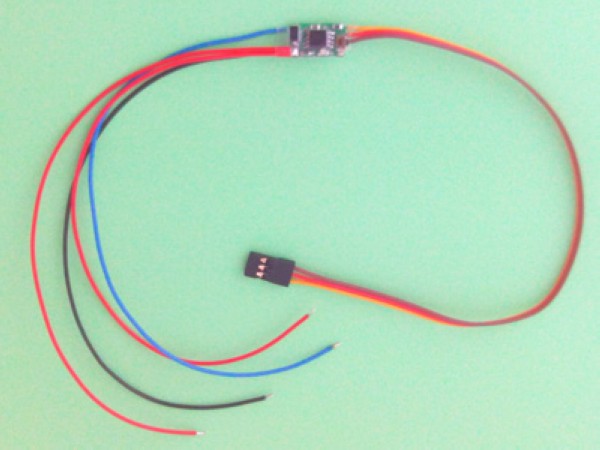 Трехцветный провод с фишкой подключается к соответствующему каналу приемника. Кнопка настройки и светодиодный индикатор расположены непосредственно на плате устройства.