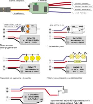 Включение данного устройства осуществляется по свободному каналу управления либо (в варианте подкала) от канала “газ”, через V-кабель, параллельно рулевой машинке. Допускается параллельное подключение двух и более блоков к одному каналу приемника.