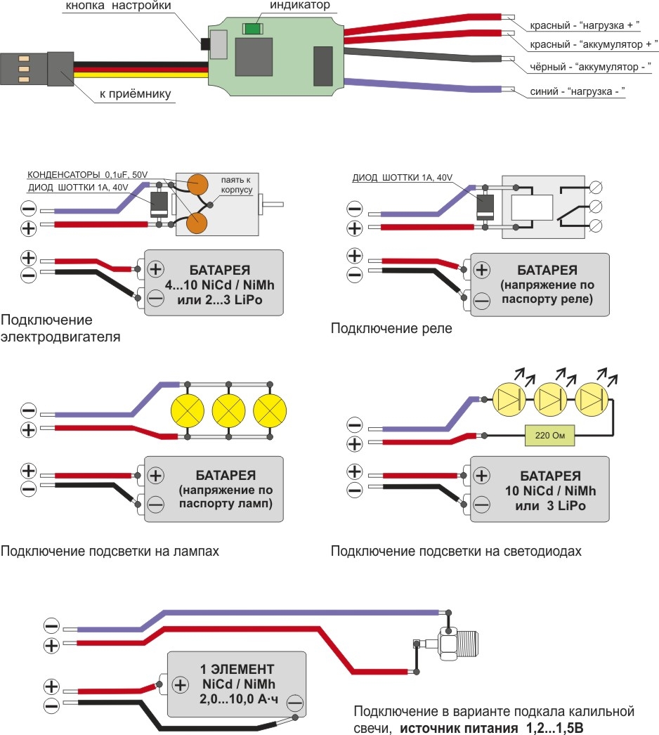 Соблюдайте полярность подключения устройства к нагрузке и внешнему аккумулятору. При использовании данного устройства в качестве бортового подкала питание допускается только от источника напряжения 1,2...1,5 В, синий провод (нагрузка “-”) следует подключить к картеру ДВС.