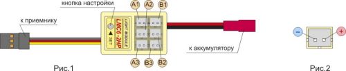 Начальные установки блока : точка включения фар - 1,5 мс, рабочий сектор 1,5-2,0 мс, нерабочий сектор 1,0-1,5 мс. Блок программируется кнопкой “SET”.
