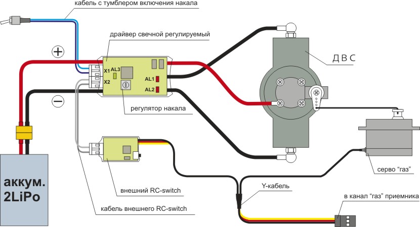 Свечные провода черного цвета необходимо укоротить до требуемой длины и дополнить их разъемами для фиксации на выступающих контактных штырьках накальных свеч. Рекомендуется использовать специализированные свечные разъемы с защитными резиновыми колпачками, предохраняющими свечные провода от короткого замыкания на корпус двигателя. Оба свечные провода после монтажа должны иметь одинаковую длину и сопротивление, иначе не будет обеспечен одинаковый накал обеих свечей. Свечи должны быть однотипными. На отдельный красный провод необходимо припаять/обжать кольцевую клемму и с ее помощью надежно соединить этот провод с корпусом ДВС. Для удобства контроля за работой драйвера его следует установить внутри модели таким образом, чтобы обеспечить обзор индикаторов (прозрачная крышка, съемный лючок и т.п.). Также необходимо обеспечить к драйверу доступ воздуха для охлаждения силовых ключей. Тумблер, включающий драйвер при запуске двигателя, следует разместить в удобном месте снаружи модели или под легкосъёмным лючком. После запуска двигателя и выведении его на устойчивый режим работы тумблер следует перевести в состояние “выключено”, чтобы не расходовать напрасно заряд аккумулятора. При этом, если используется внешний RC-switch, дальнейшее управление будет осуществляться через него от соответствующего канала пульта управления. Это может быть как канал газа, так и отдельный канал, микшируемый с каналом газа. В случае применения общего канала газа, драйвер и сервомеханизм, управляющий дроссельной заслонкой, следует подключать через Y-кабель.